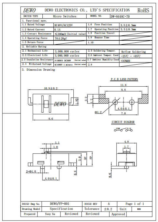 超小型微動開關 CM1873101S100-2